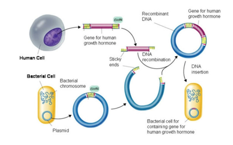 DNA tái tổ hợp là một loại DNA được tạo ra bằng cách kết hợp vật liệu di truyền từ hai hoặc nhiều sinh vật khác nhau. Các nhà khoa học sử dụng enzyme cắt (gọi là enzyme cắt giới hạn) để cắt đoạn DNA cần thiết, sau đó chèn nó vào một phân tử DNA khác chẳng hạn như plasmid của vi khuẩn. Nhờ quá trình này, các nhà khoa học có thể chuyển gen giữa các sinh vật không có quan hệ họ hàng gần gũi với nhau trong tự nhiên, tạo ra những sinh vật có những đặc điểm như mong muốn.
