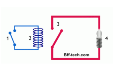 Chúng ta có thể quan sát sơ đồ mô tả dưới đây để dễ hình dung hơn. Khi có dòng điện chạy qua mạch (1) nó sẽ kích hoạt nam châm điện (màu nâu). Từ đó tạo ra một từ trường hút một tiếp điểm (màu đỏ). Sau đó kích hoạt mạch thứ hai ( 2 ). Khi nguồn điện bị cắt, một lò xo lắp trước tiếp điểm sẽ có nhiệm vụ kéo tiếp điểm về vị trí ban đầu. Và tắt mạch thứ hai một lần nữa.