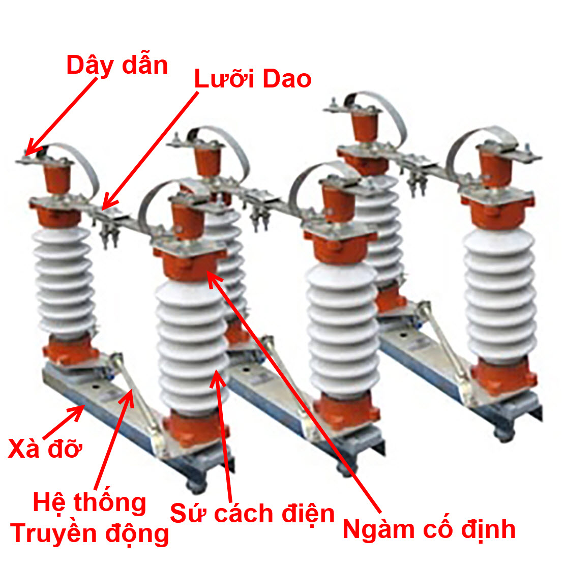 Cấu tạo của cầu dao cách ly gồm 6 phần như hình dưới: