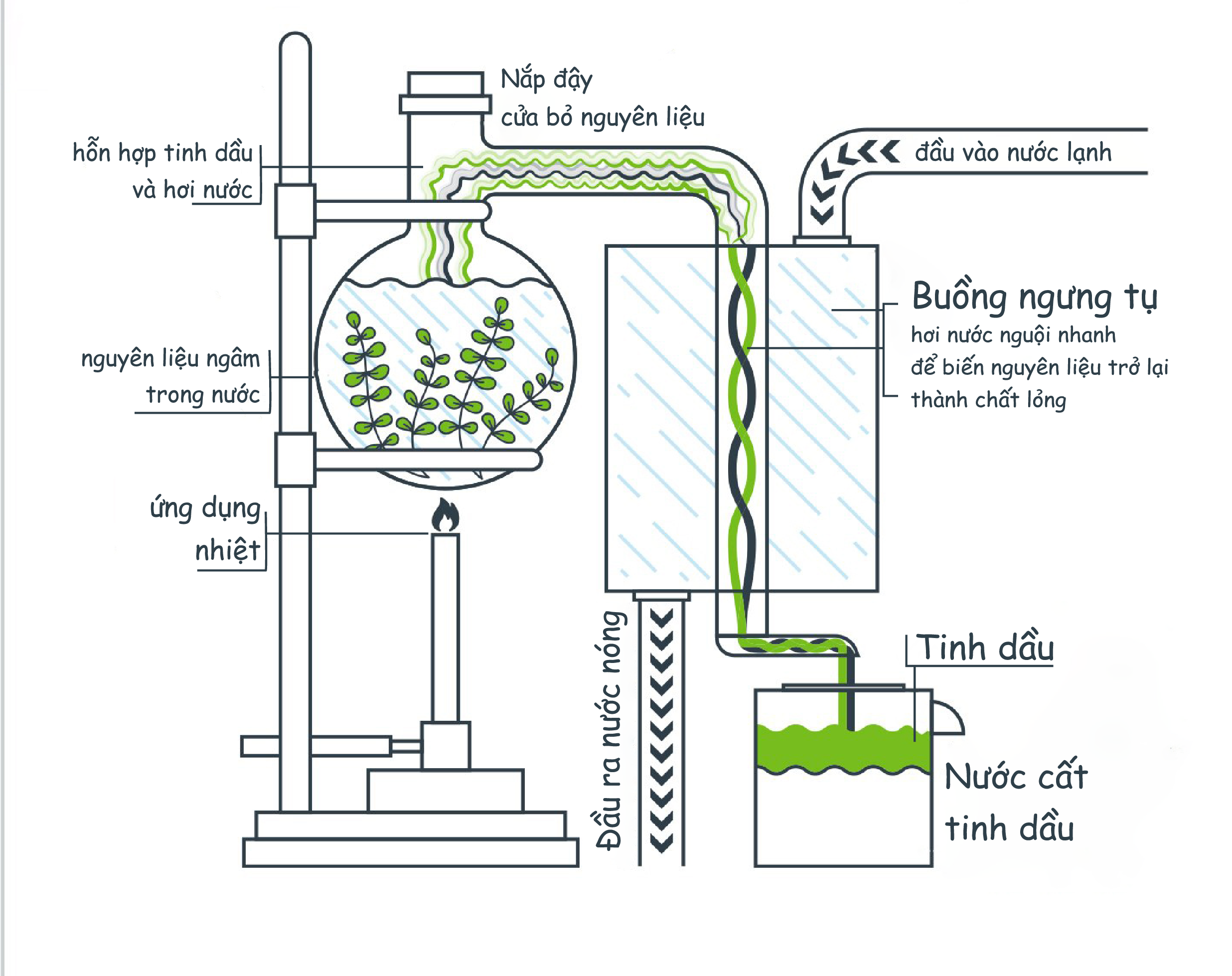 – Phương pháp chưng cất bằng hơi nước: Thường được áp dụng để tách các chất trong tinh dầu. Dựa trên sự khuếch tán và thu hút hơi nước của các chất có trong tinh dầu khi tiếp xúc với nước ở điều kiện nhiệt độ cao.