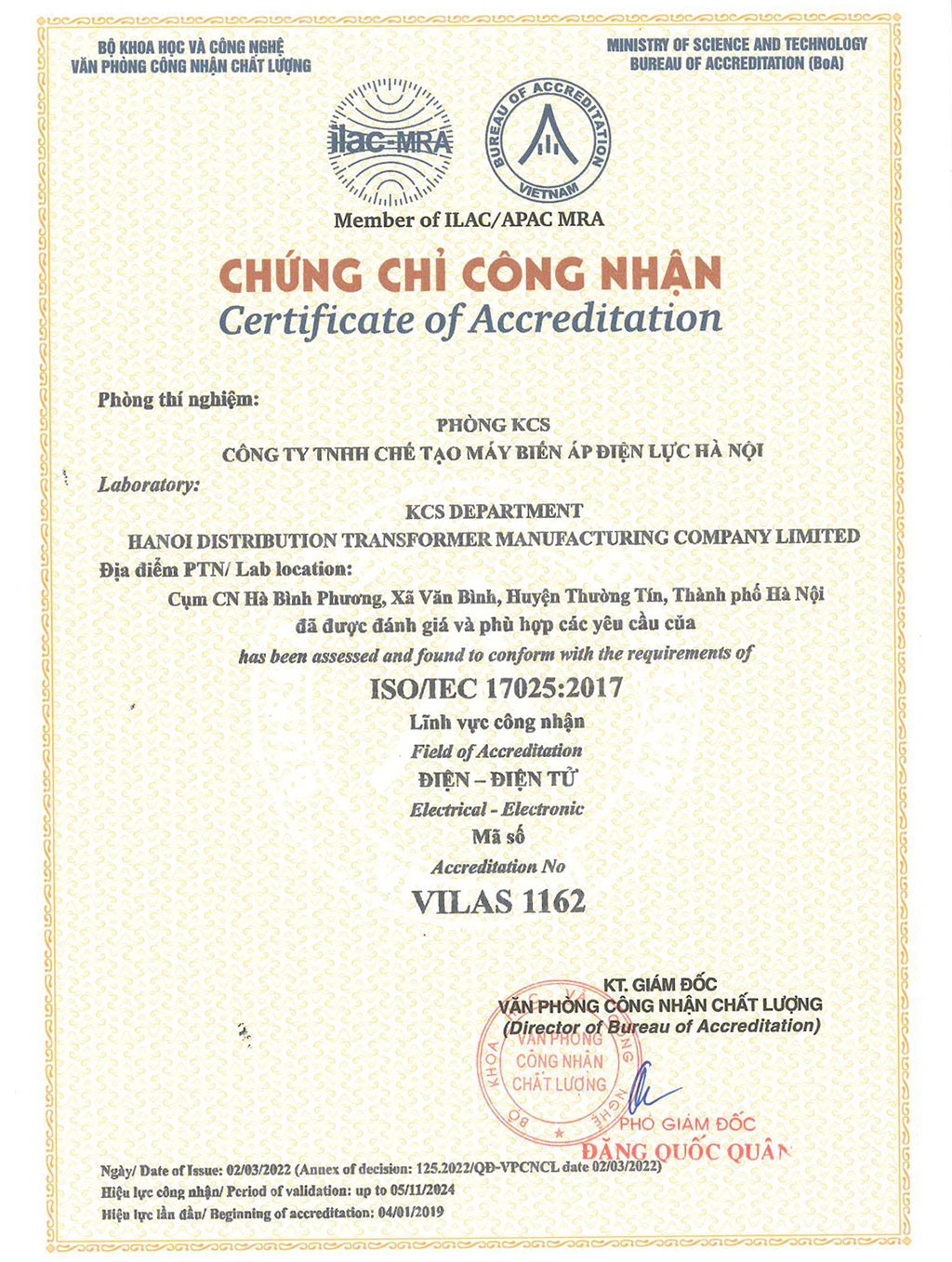Công ty TNHH Chế tạo Máy biến áp CTBA Hà Nội với thương hiệu máy biến áp CTBA là một trong những đơn vị được “Văn phòng Kiểm định Chất lượng” trực thuộc Bộ Khoa học và Công nghệ (BOA) công nhận là Phòng thí nghiệm thử nghiệm máy biến áp CTBA đạt tiêu chuẩn ISO/IEC 17025 -2017 Vilas 1113. Nhờ quá trình kiểm tra nghiêm ngặt nên tất cả các sản phẩm máy biến áp CTBA trước khi đến tay khách hàng đều đạt tiêu chuẩn quốc tế. tiêu chuẩn quốc tế, tiêu chuẩn Việt Nam (TCVN) cũng như theo quy định của ngành điện lực ban hành. Ngoài ra, với các đơn hàng sản xuất theo yêu cầu cụ thể, quá trình thử nghiệm, thử nghiệm máy biến áp còn có sự chứng kiến của chủ đầu tư, đảm bảo sản phẩm tạo ra đáp ứng tốt nhất nhu cầu của khách hàng. Hiểu rõ vai trò của việc thử nghiệm sản phẩm trước khi đưa vào sử dụng và vận hành, tất cả các máy biến áp mang nhãn hiệu CTBA của Công ty TNHH Sản xuất Máy biến áp điện CTBA Hà Nội đều đáp ứng các tiêu chuẩn hiện hành như: • Tiêu chuẩn IEC 60076-1-2-3-5 :2011 và ISO 6306-1-2-3-5:2015. Nghị quyết 1011/QĐ-EVN ngày 07/4/2015 của Tổng công ty Điện lực miền Bắc về việc ban hành tiêu chuẩn tổn thất trong máy biến áp phân phối Điện áp. • Quyết định số 62/QĐ-EVN ngày 05/5/2017 của Tổng công ty Điện lực Việt Nam. Quyết định số 2608/QD-EVNSPC ngày 03/9/2015 của Tổng công ty Điện lực miền Nam. • Tiêu chuẩn của Tổng công ty Điện lực TP.HCM: Quyết định số 3370/EVN TP.HCM-KT ngày 04/9/2018 của Tổng công ty Điện lực TP.HCM.